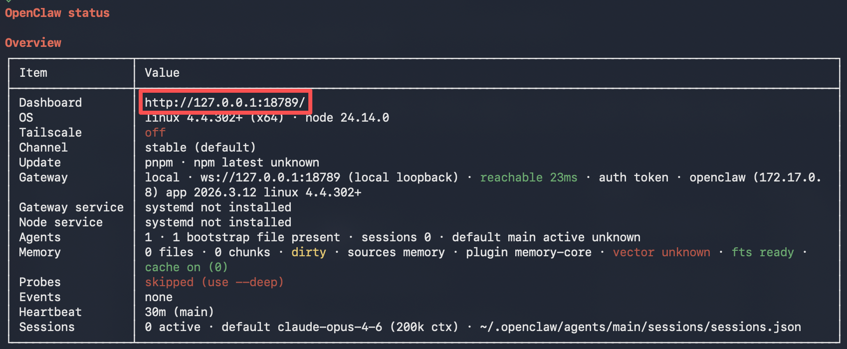 openclaw status检查启动状态。