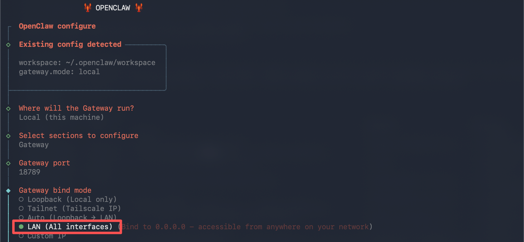 openclaw config,改bind mode为lan模式,如下: