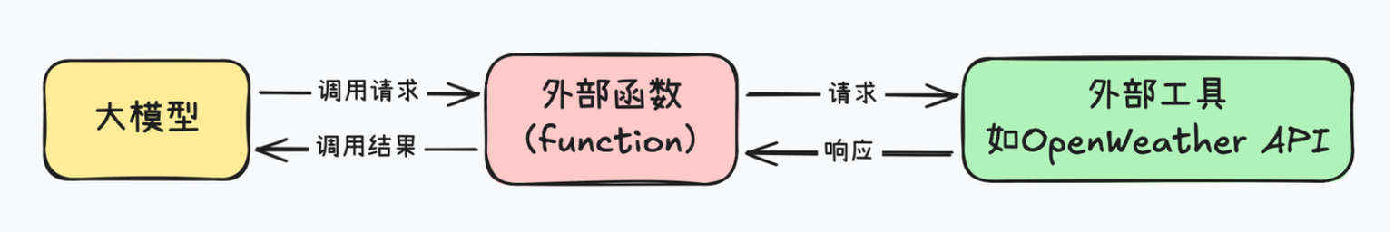 由于底层技术限制,大模型本身是无法和外部工具直接通信的,因此 Function Calling 的思路,就是创建一个外部函数(function)作为中介,一边传递大模型的请求,另一边调用外部工具,最终让大模型能够间接的调用外部工具。